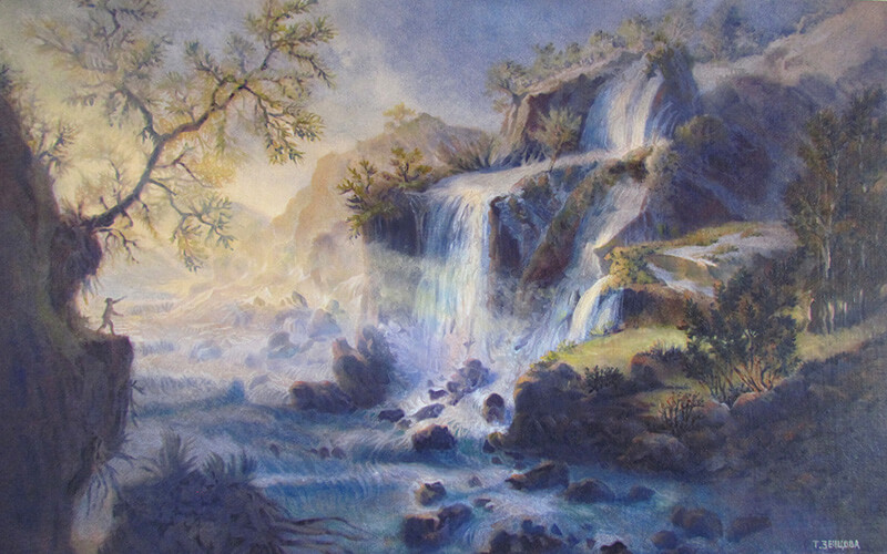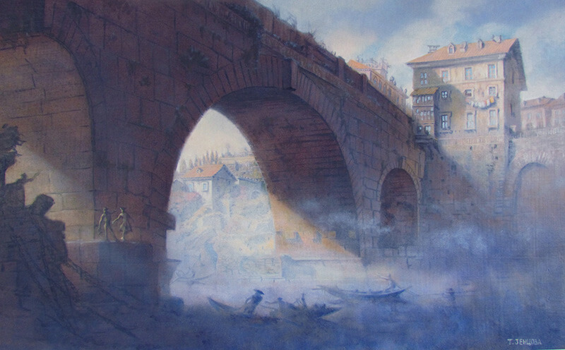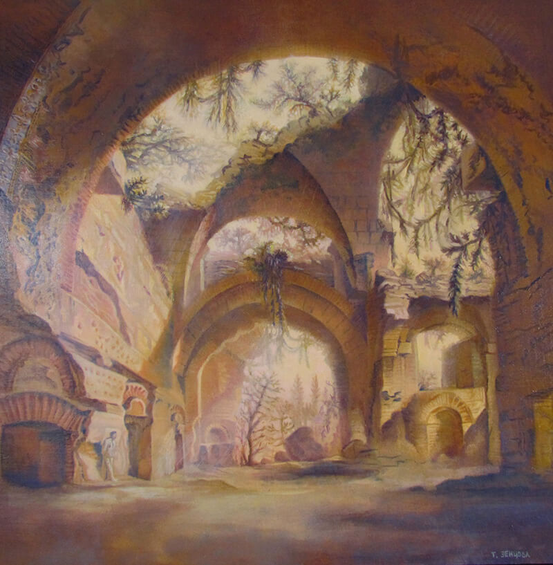 La artista se basa en los grabados realizados en aquella epoca por Giovanni Battista Piranesi (1720 -1778), imagina y recrea colores, ambientes, iluminacion, introduce lectura propia de estas reliquias del pasado e invita a habitarlas en su imaginario.